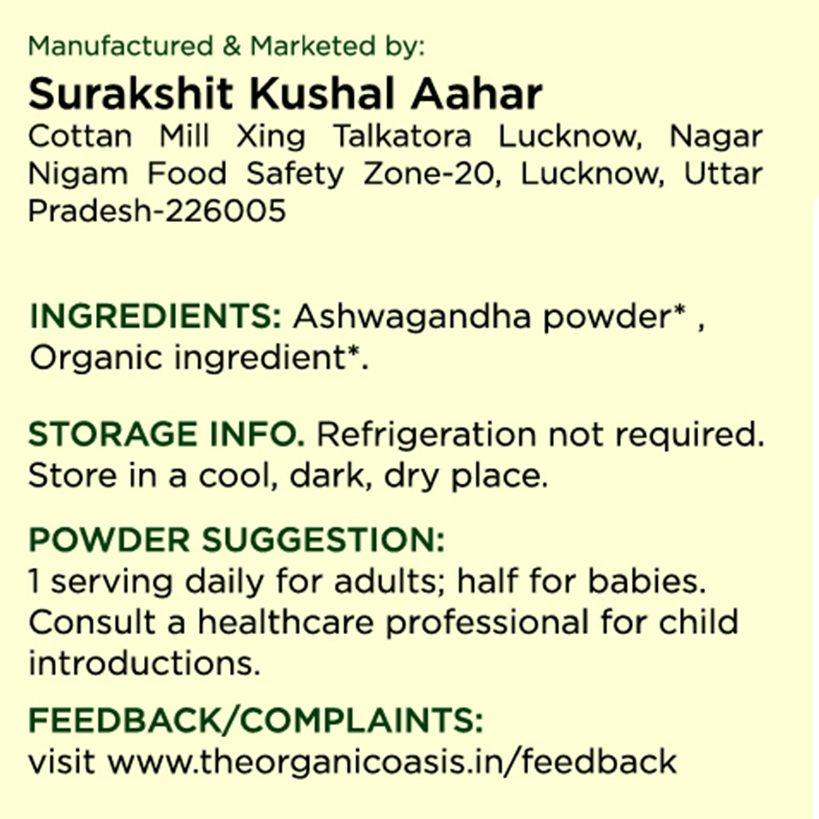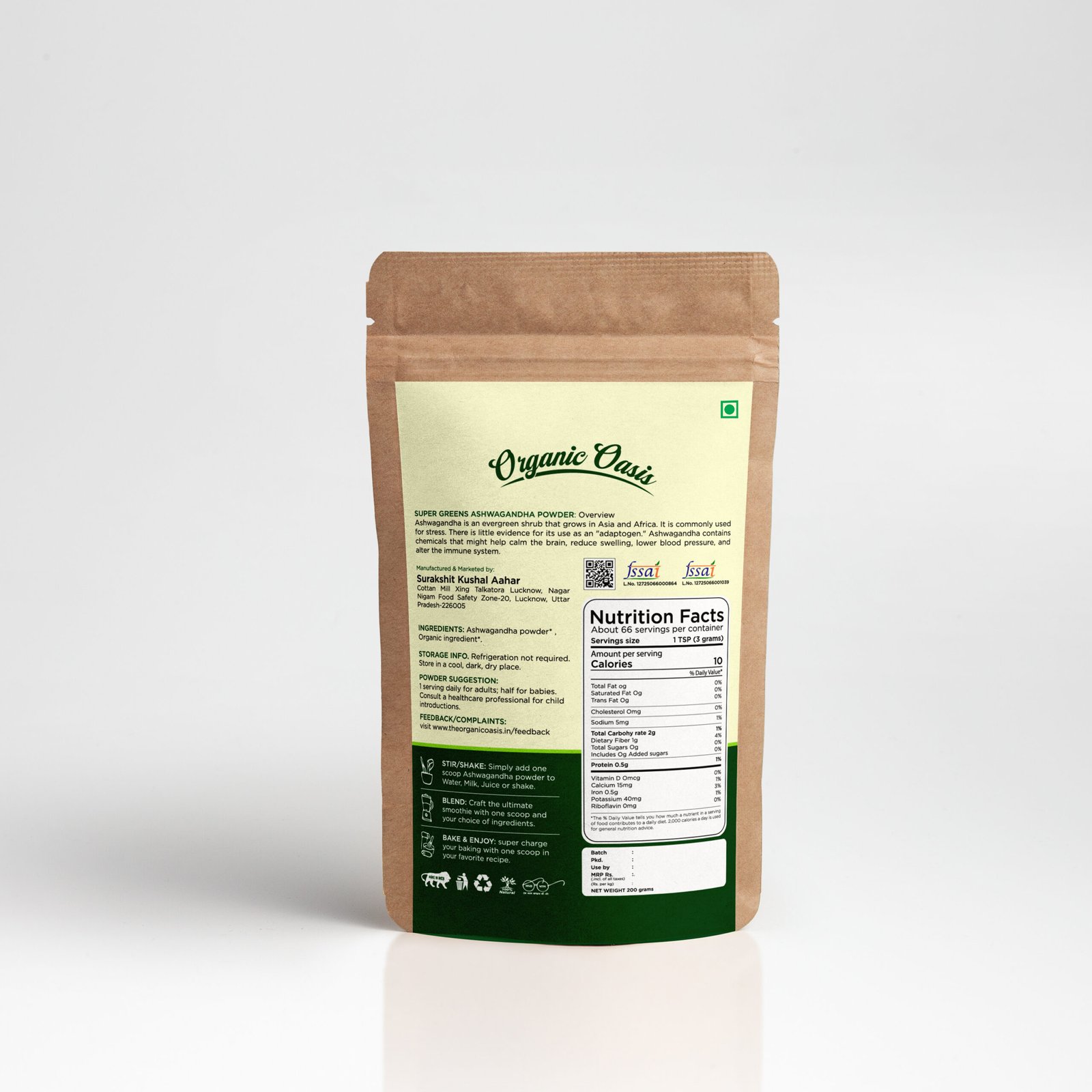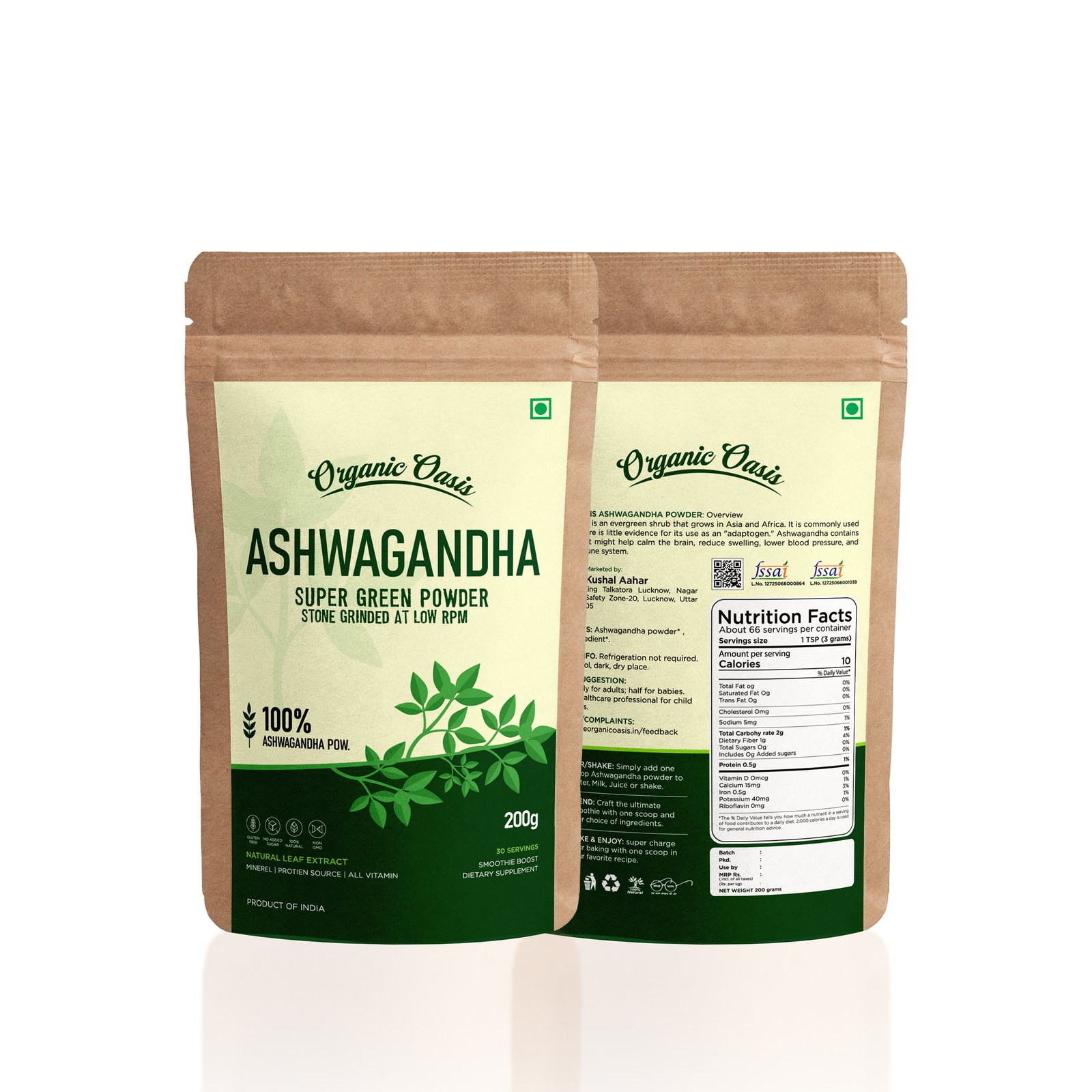 Orgnaic Oasis Aswagandha Leaf Powder is made from 100% pure, naturally dried Aswagandha leaves. Known as a “superfood,” Aswagandha is packed with essential vitamins, minerals, and antioxidants that help support overall health and wellness. Sourced from the nutrient-rich soil of India, this green powerhouse is finely ground to preserve its natural goodness and deliver maximum nutrition in every spoonful.